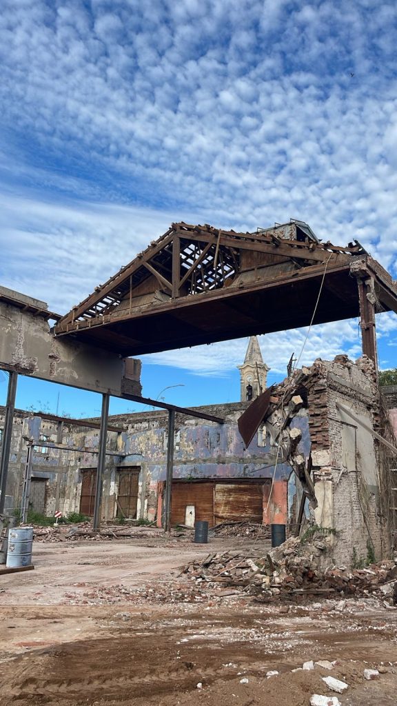 Continúan trabajos de desmontaje controlado de sectores deteriorados, como cubiertas y estructuras inestables. En ese marco se están retirando módulos de claraboyas y elementos constructivos con grúa, para poder evaluar su estado y analizar su restauración o reutilización dentro de la obra.